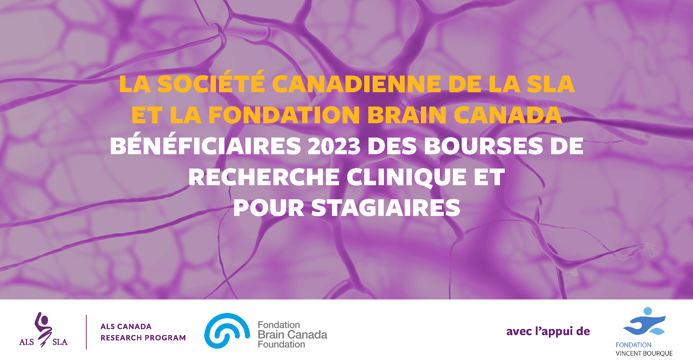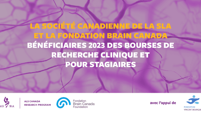 « Investir dans l’avenir de la recherche sur la SLA signifie investir dans les jeunes esprits brillants qui possèdent les connaissances nécessaires pour éclaircir les complexités de la maladie », déclare la Dre Viviane Poupon, présidente-directrice générale de la Fondation Brain Canada. « Grâce au programme de bourses de recherche clinique et de bourses pour stagiaires, la Fondation Brain Canada est fière de soutenir ces scientifiques prometteurs, alors qu’ils façonnent un avenir plus prometteur pour ceux qui combattent la SLA. »