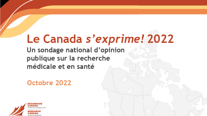 OTTAWA, le 12 octobre 2022 – Les Canadiens continuent de penser que le Canada devrait être un leader mondial en matière de recherche médicale et en santé, selon un nouveau sondage sur cette question publié par Recherche Canada : Une alliance pour les découvertes en santé. Une majorité de Canadiens pensent que le gouvernement fédéral devrait augmenter sa dépense en ce domaine.