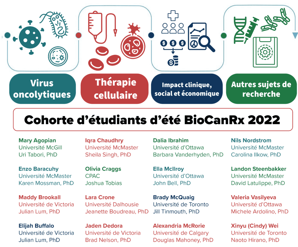 BioCanRx est heureuse de vous présenter les 16 étudiants de premier cycle de partout au Canada choisis dans le cadre d’un processus de candidature concurrentiel pour faire partie de notre programme de bourses d’été pour étudiants. L’objectif de ce programme est d’inciter la prochaine génération de personnel hautement qualifié à poursuivre des recherches en immuno-oncologie du cancer ou toute politique liée au cancer. Les étudiants de premier cycle et les étudiants collégiaux reçoivent des fonds pour mener des recherches avec les chercheurs du réseau BioCanRx. Ce programme offre aux étudiants une expérience de recherche pratique et concrète.