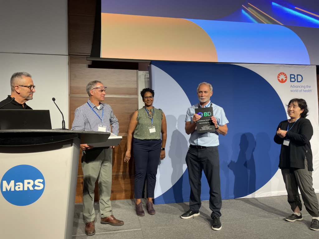 Presentation of the Early Adopter of Technology Plaque to Michael Parsons and Annie Bang of Lunenfeld-Tanenbaum Research Institute, Sinai Health Systems, by BD Biosciences’ Dionne White (Technical Applications Specialist), Scott Hayes (Account Manager) and Robert Balderas (VP Biological Sciences).